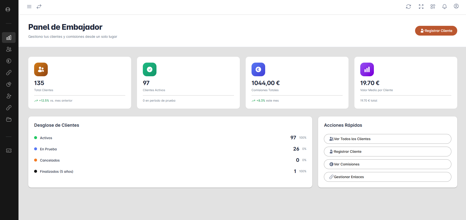 Accede a tu listado de referidos, visualiza quién está en prueba gratuita y quién ha contratado, y conoce exactamente cuánta comisión generas por cada uno al mes.