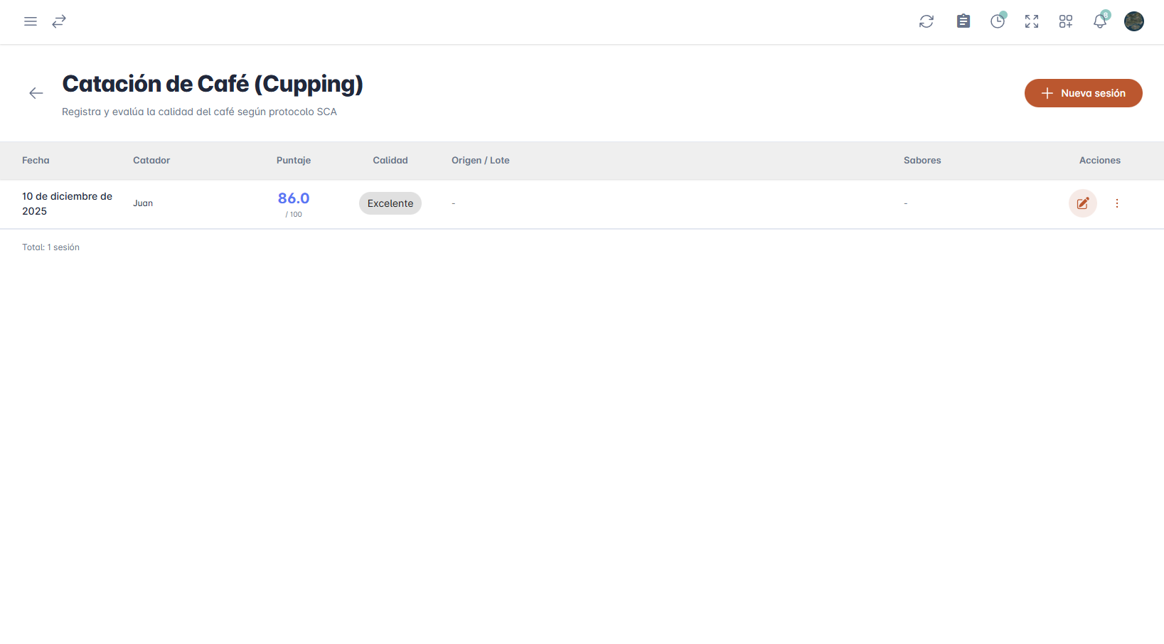 - ✅ Cupping (Catación) Integrado: Registra aroma, sabor, puntuación y evolución por lote. Así puedes vincular la calidad del resultado con los datos de producción para mejorar tus recetas.