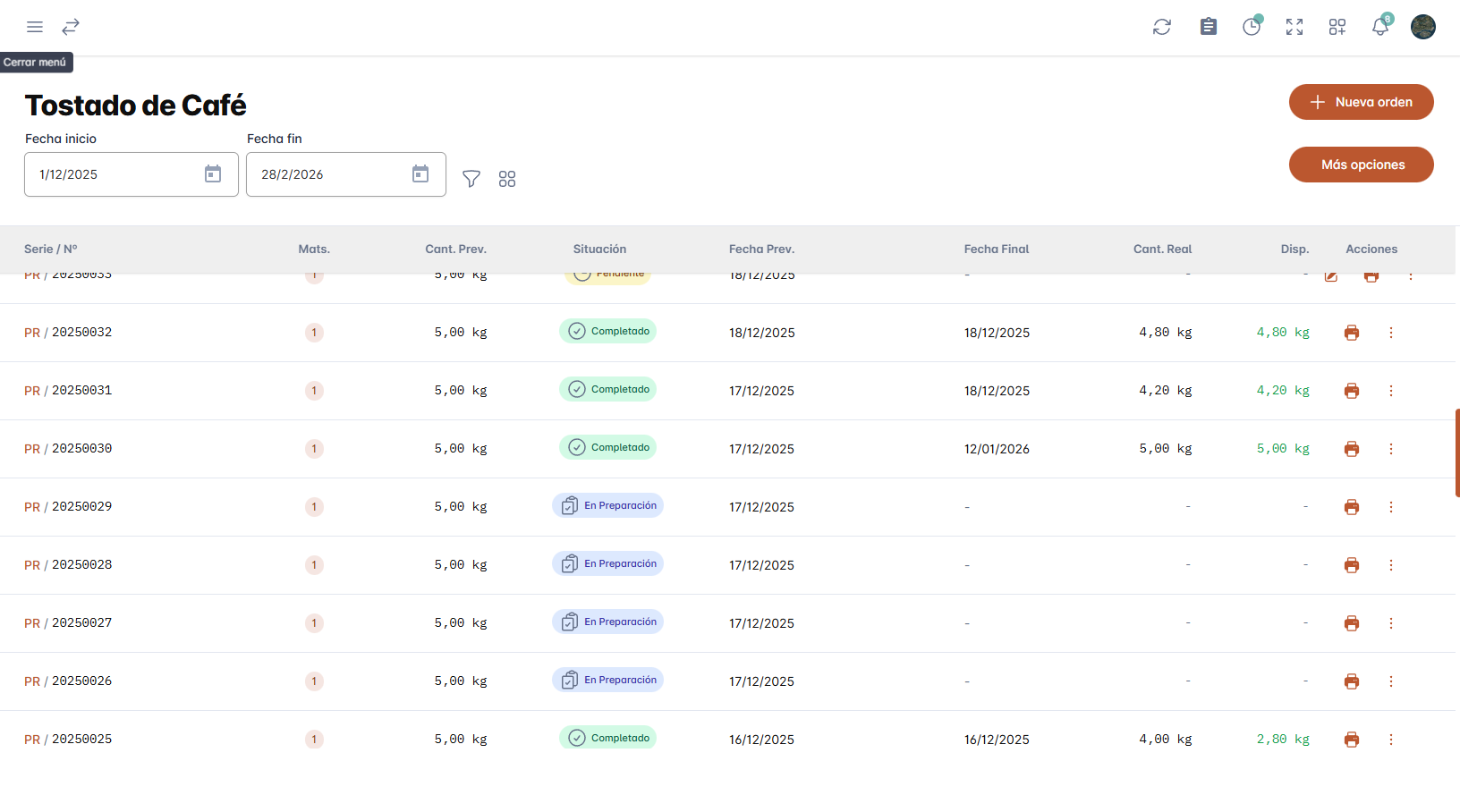 Basándonos en esas conversaciones, construimos dentro de Kiby ERP un módulo nativo de fabricación pensado específicamente para las necesidades del sector del café. No queríamos adaptar una herramienta de fábricas de tornillos; queríamos que hablase el idioma del café.