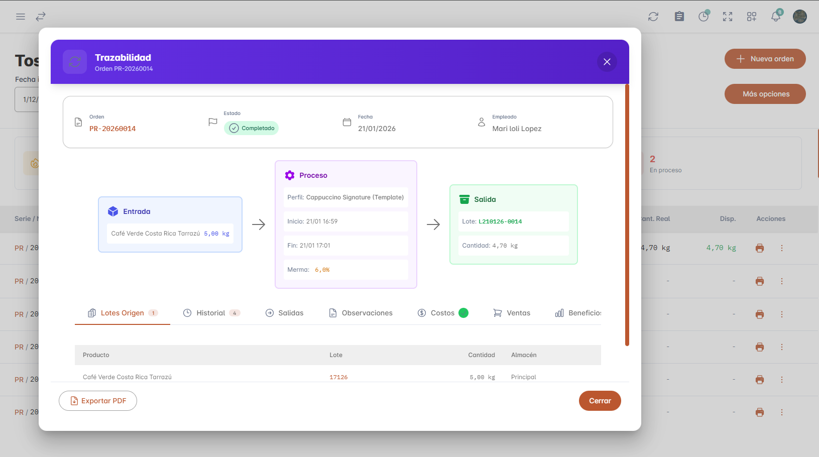 En alimentación, la seguridad no es opcional. Con nuestro sistema, la trazabilidad es automática. Desde que entra el saco de verde hasta que sale el paquete de 250g al cliente final o a la cafetería, todo queda registrado por lotes. Si necesitas recuperar un lote, lo haces en segundos, cumpliendo estrictamente con la normativa sanitaria.